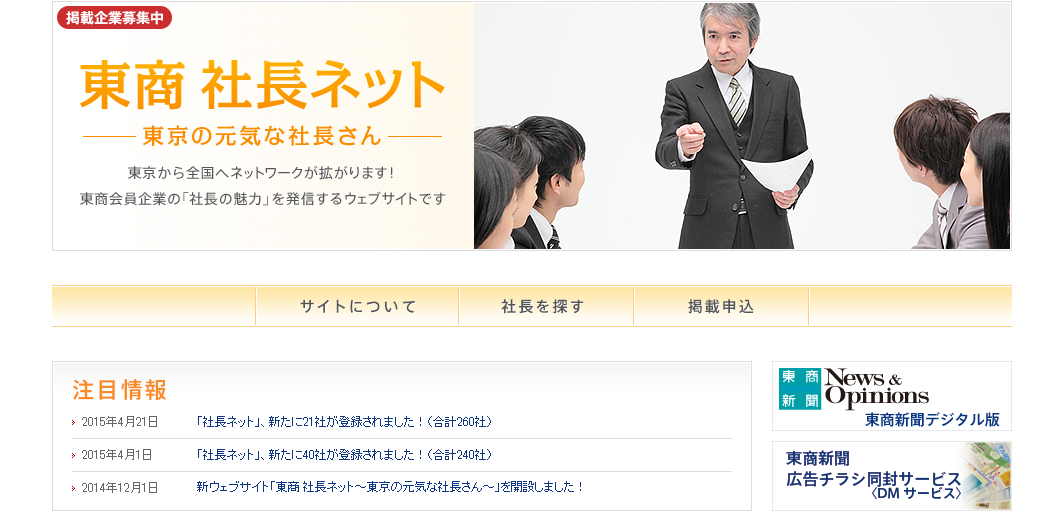 昨年12月に開設しました会員企業の社長紹介サイト「東商社長ネット ~東京の元気な社長さん~ 」について、サイトのトップページ等をリニューアルしました。