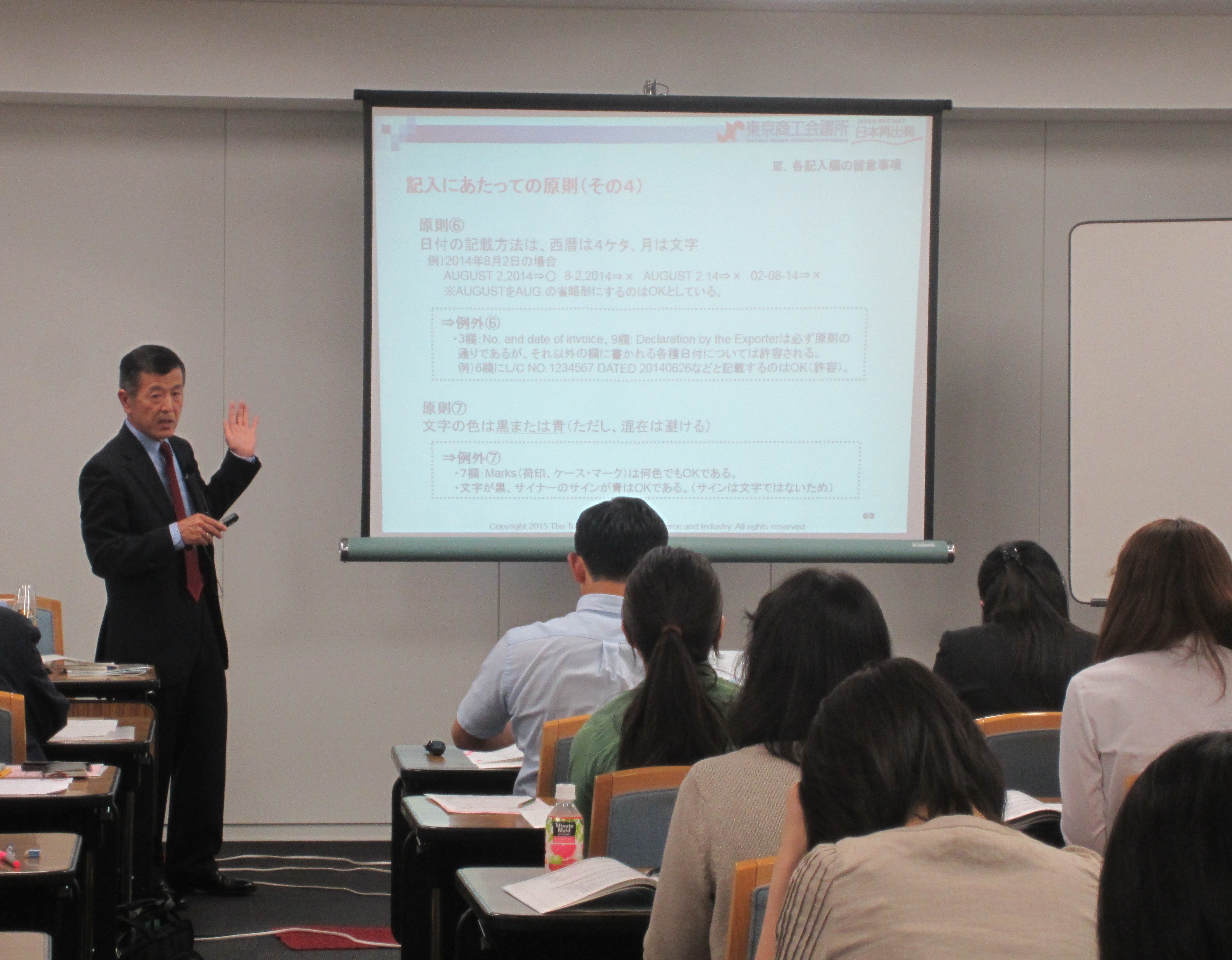 東京商工会議所研修センターは5月15日(金)に、「非特恵原産地証明申請の基礎実務講座」(講師:貿易証明アドバイザー・松本猛氏他)を開催、32名が参加しました。