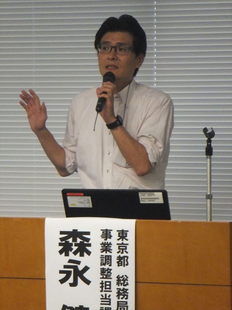 講師を務めた東京都総務局総合防災部 事業調整担当課長の森永健二氏は、東日本大震災の様子や阪神淡路大震災の状況を振り返り、「自助」「共助」の取り組みの重要性を指摘した上で、一昨年4月に施行された帰宅困難者対策条例について、都内事業者・都民に対する努力義務や事業者が取るべき対策などを中心に説明を行いました。