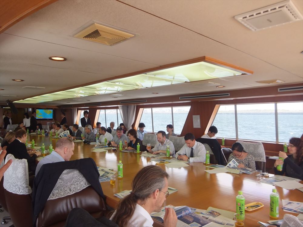 参加者は、東京都の視察船「新東京丸」に乗船し、新しく客船ターミナルが整備される予定の青海地区や2020年オリンピック・パラリンピック大会の競技予定地等、東京港の将来について、日本語と英語で解説を受けました。
