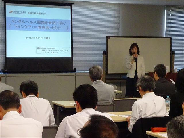 東京商工会議所板橋支部では、5月21日にOffice Takeshima代表の武島洋子氏を招き、「メンタルヘルス問題を未然に防ぐ “ラインケア”セミナー」を開催しました。