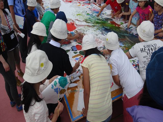 文化振興の一環として、フランスで活躍する松井守男画伯と港区内の小学生102名で20平方メートルの巨大なキャンパスに油絵を描きました。参加したのは港区の御成門小、麻布小、東洋英和女学院小学部の3~5年生。また、武蔵野美術大学の学生もボランティアとして参加しました。