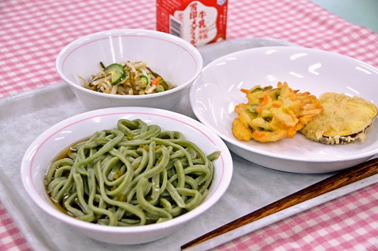 あだち菜うどんは、足立区特産品の小松菜を生のまま小麦粉に練りこんだ太麺で、鮮やかな緑色が特徴。冷やした「ぶっかけうどん」スタイルで出された給食に、生徒たちは、「色がきれい」「小松菜の味が少しだけする」「美味しい」などと笑顔で完食しました。
