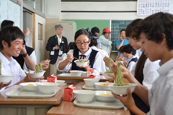 東商足立支部が中心となって発足した「足立区新ご当地グルメ創造プロジェクト」の開発した『あだち菜うどん』が6月8日、区立入谷中学校の学校給食のメニューに採用されました。今後、区内の小中学校の給食でも順次登場する予定です。