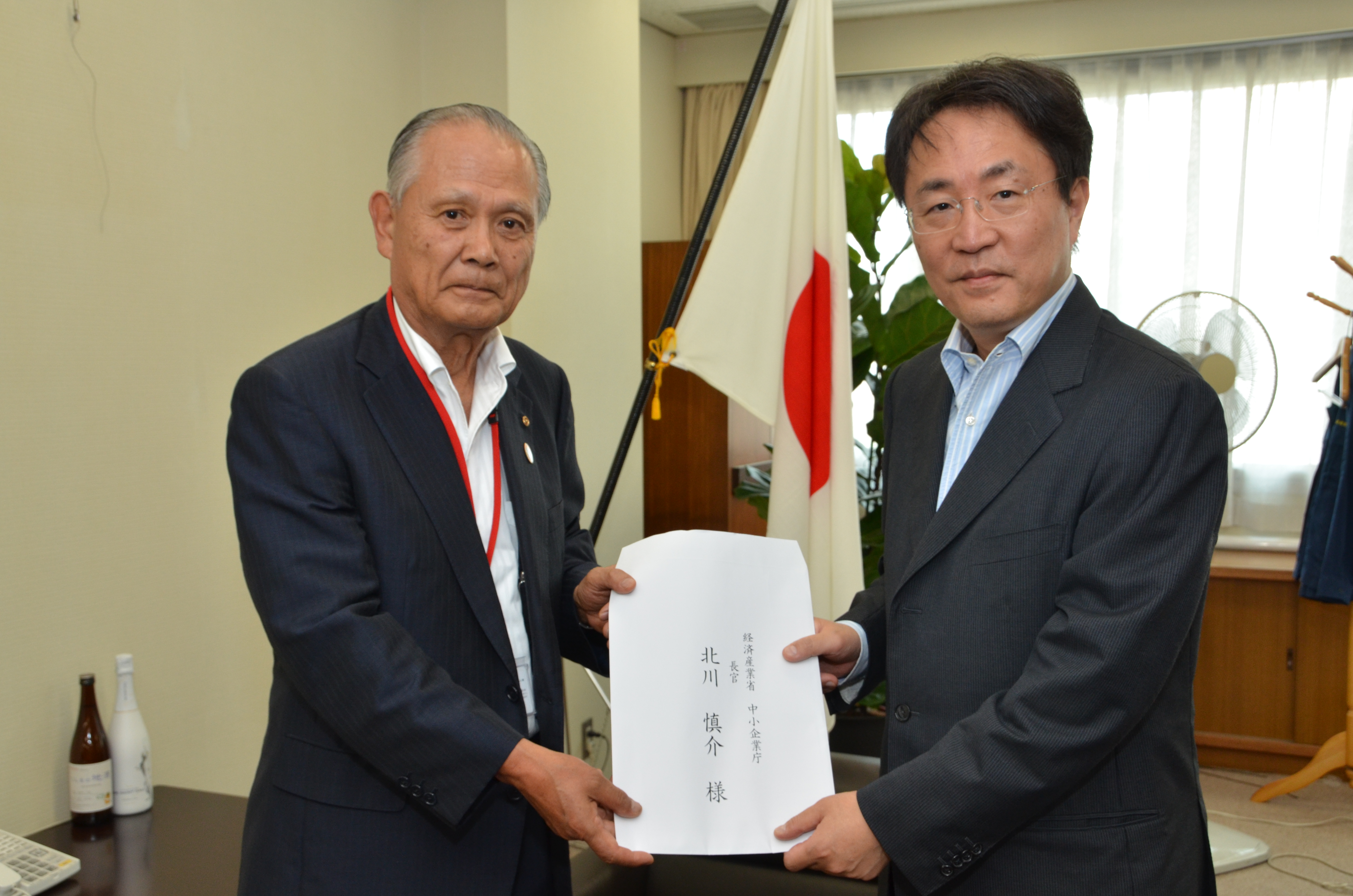 石井副会頭・中小企業委員長は7月30日に北川中小企業庁長官を訪問し、9日に決議した「国の中小企業対策に関する重点要望」を直接提出し、早期実現を求めました。