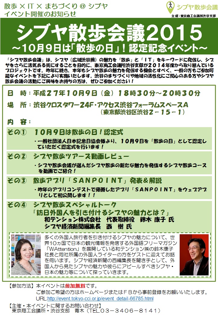 「シブヤ散歩会議2015 ~10月9日は「散歩の日」!認定記念イベント~」 開催概要