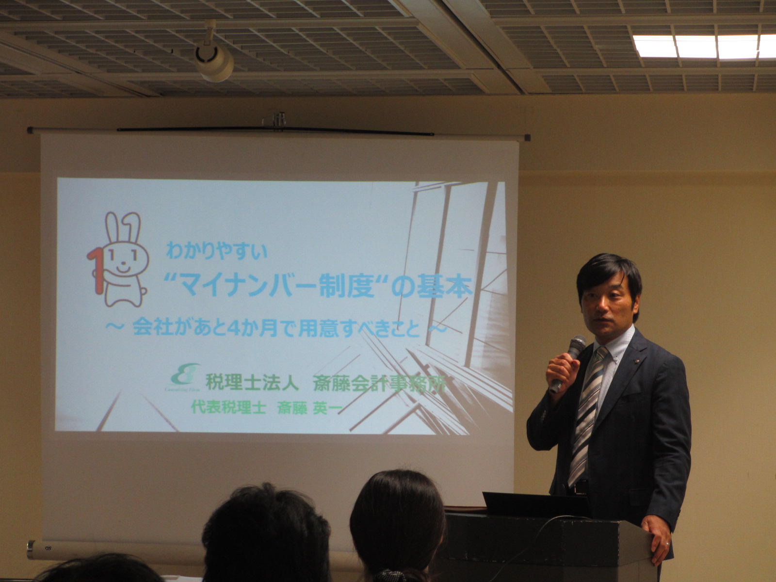 講師の斎藤英一税理士には、再度、各事業所における「マイナンバー制度」の取り扱いにあたって、また従業員や取引先とのやり取りの注意点を丁寧に解説していただきました。