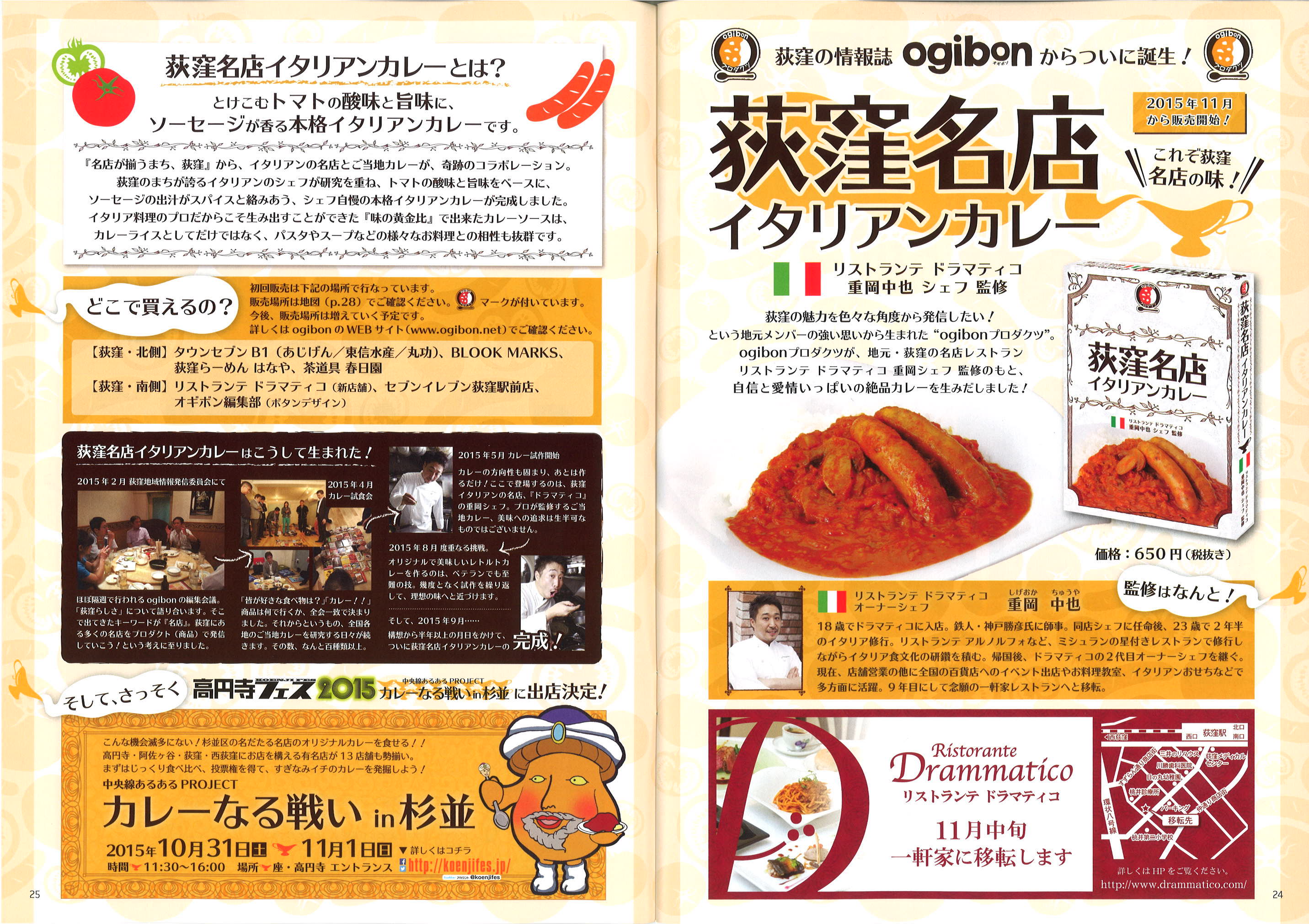 本品は地域情報誌Ogibon(オギボン)を作成・発刊してきた荻窪で働く20~40代中心の9人の若手経営者等が“荻窪の魅力”を検討し、荻窪のイタリアンの名店シェフ監修のもと、地域のご当地カレーとして企画したものです。トマトの酸味と旨味をベースに、ソーセージの出汁がスパイスと絡み合う本格イタリアンカレーです。荻窪駅タウンセブン等で販売する他、今後は区内の小売店等に販売網を広げていく予定です。
