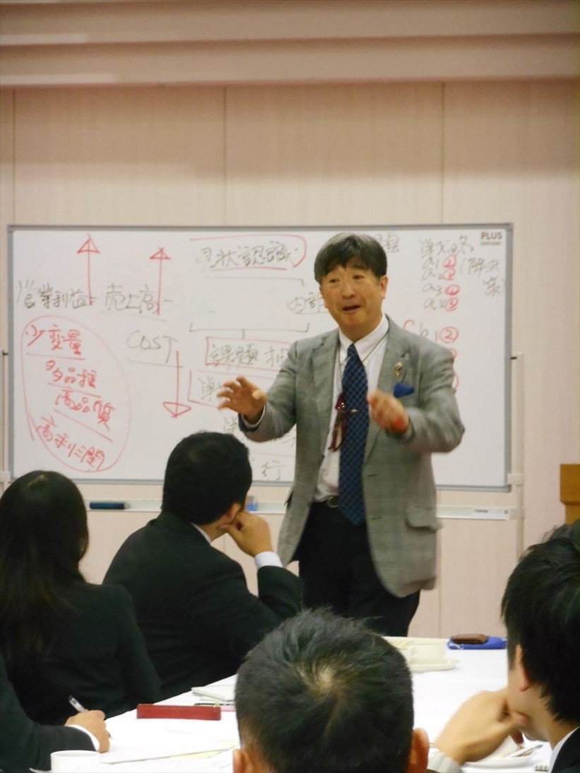 今回は、テレビ、ラジオ等でも活躍されている愛知淑徳大学ビジネス学部学部長の真田幸光氏をお招きし、国内情勢とものづくり大国としての日本の展望について学び、その後、若手経営者一人一人が自社PRを行いました。