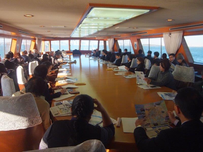 本視察会・セミナーでは、東京都港湾局の視察船「新東京丸」に乗船し、海上から東京港を視察した後、青海にある「東京みなと館」を見学しました。