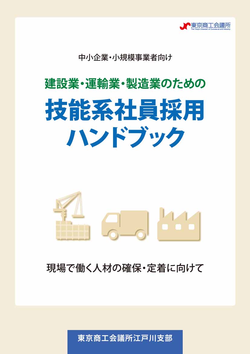 東京商工会議所江戸川支部(会長:平田善信・平田紙興(株)代表取締役会長)は、平成28年1月、建設業・運輸業・製造業における現場社員確保のための募集PRや定着の方法をわかりやすく解説した小冊子「建設業・運輸業・製造業のための技能系社員採用ハンドブック」を発行しました。