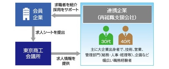 本事業では、採用を希望する求人企業が求人シートを東商に提出し、東商が内容を確認した上で、両社に情報を提供。その後、両社から求人企業へのヒアリングが実施された後、求職者に求人情報を公開。さらに両社が保有する求職者情報の中から最適な人材がいれば求人企業に紹介します。