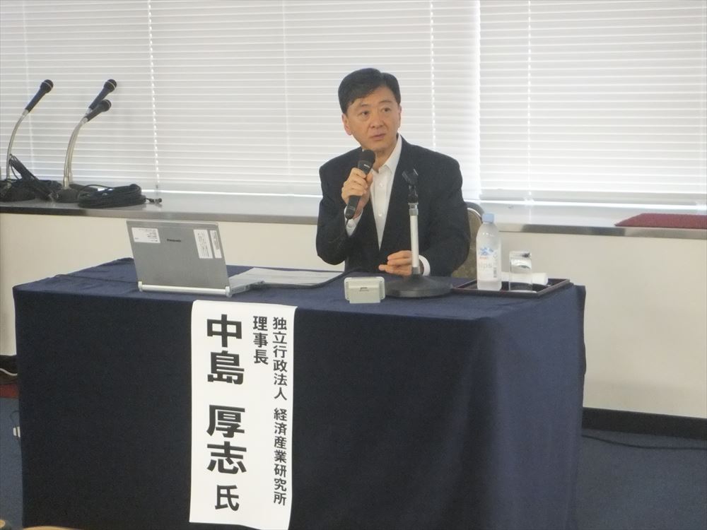 講師を務めた独立行政法人 経済産業研究所 理事長の中島厚志氏は、世界経済は、「人、モノ、金、エネルギーすべてが過剰の時代に入った」と述べ、原油価格低迷やイギリスのEU離脱の影響、中国や米国経済の状況について説明いただきました。その中で、日本経済は「今後も一進一退が続く見込み」とし、短期的な財政政策と共に、長期的視点から少子高齢化対策やイノベーション促進の重要性を強調しました。