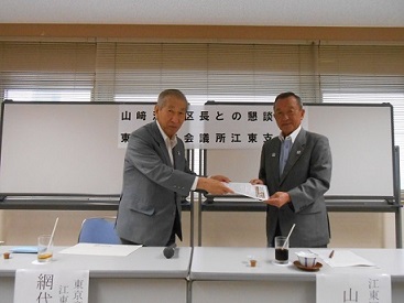 区長との懇談会では、優秀な人材の不足に対応した支援や、オリ・パラ開催に向けた動き、豊洲市場の開場と千客万来施設、地下鉄8号線の延伸について等、活発な意見交換が行われました。その後、網代江東支部会長より、山﨑江東区長へ産業振興政策に関する要望書を提出しました。