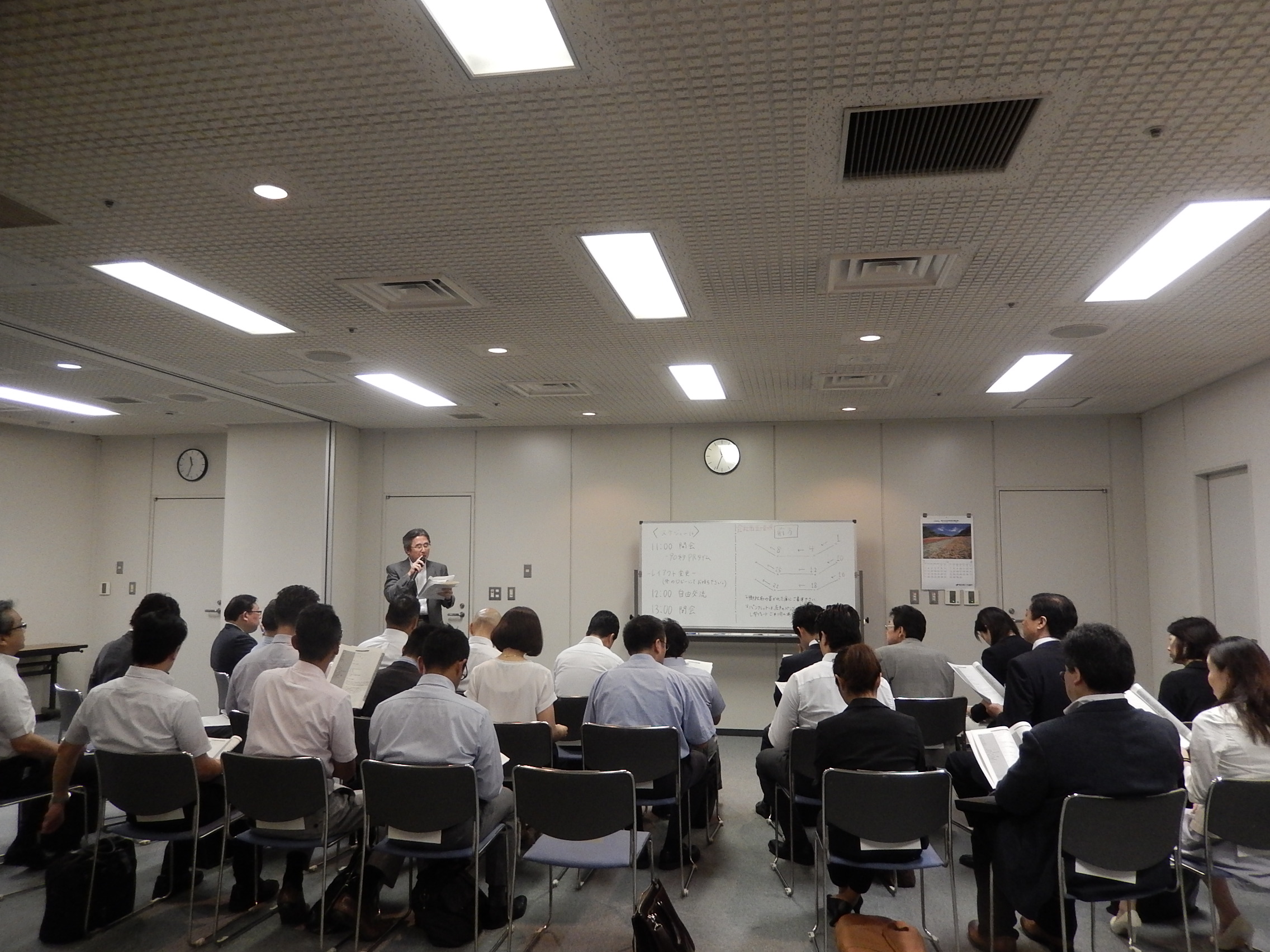 参加者は90秒間で自社PRを実施し、その後交流懇親会に移りました。交流懇親会では、参加者同士で名刺交換を行った後、自社パンフレットなどを渡しながら、交流する様子が見られました。