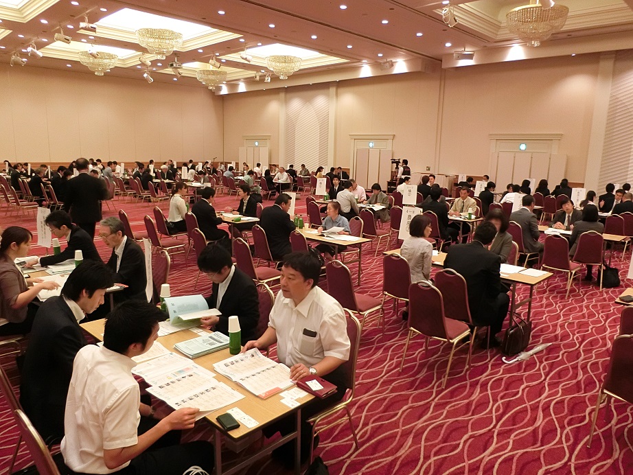 本面接会では、来春に高校・専門学校の新卒者採用を予定している会員企業118社から179人の採用担当者と、城東地区や近隣地区の高校・専門学校25校69人の就職担当教職員が参加し、業務内容や雇用面などについて情報交換しました。