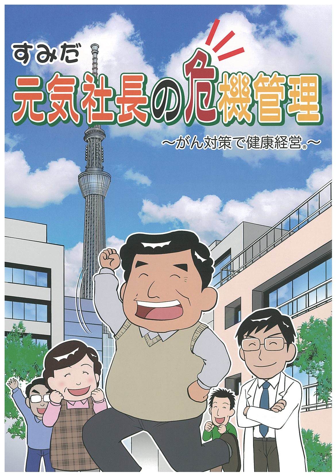本冊子は、主に経営者に対して、「がん」が企業経営に与えるリスクとそれを未然に防ぐ方法を「マンガ」で解説しています。また、早期発見・早期治療により事業や就労に及ぼすリスクも軽減できるため、墨田区が行なう「がん検診」や「万が一、がんに罹患した際に利用できる諸制度やサービス」の紹介、実際にがんを経験した社長の体験談も掲載しています。