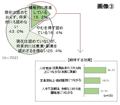 ○兼業・副業を「現在・将来共に認めない」が43.0%と最も多くなったが、「積極的に推進している」も15.2%に上った。