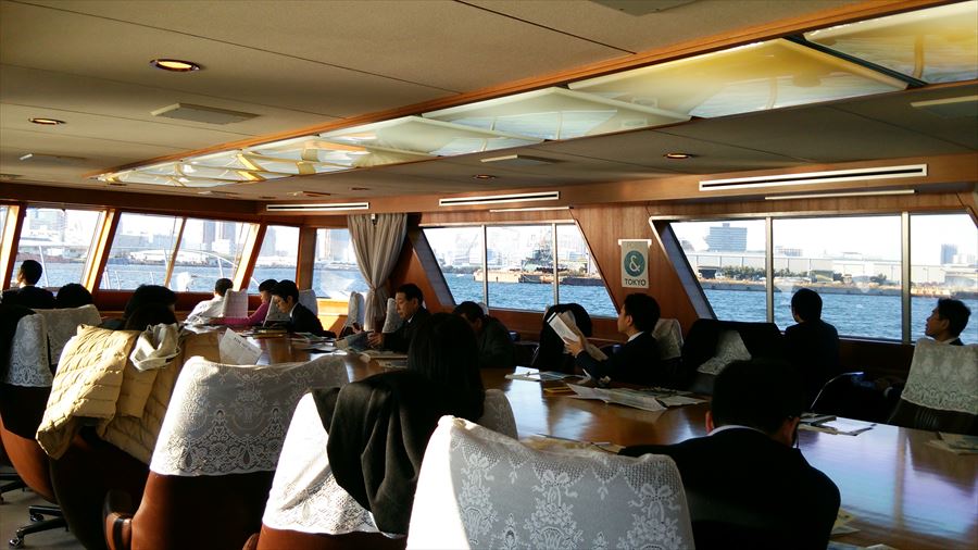 本視察会・セミナーでは、東京都港湾局の視察船「新東京丸」に乗船し、東京都港湾局 広報担当課長の西平氏、および港湾営業専門課長の山田氏から、クルーズ客船の誘致や東京港の将来計画、津波・高潮対策等についてご説明いただきました。