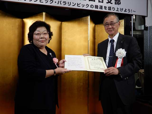 冒頭、大場会長、佐々木副会頭から開会の挨拶があり、続けて来賓を代表して保坂区長から祝辞をいただきました。ご来賓の紹介後、永年会員表彰を行い、受賞した66社を代表して平原幸代・平原商事株式会社代表取締役社長に佐々木副会頭から感謝状を手渡しました。