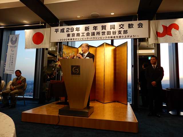 当日は世田谷区の保坂展人区長をはじめ、国会議員、都・区議会議員、関係団体の長など多くの来賓が参加、東京商工会議所本部からも佐々木隆副会頭が出席し、世田谷支部会員とあわせ200名以上が新しい年を祝いました。