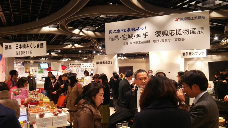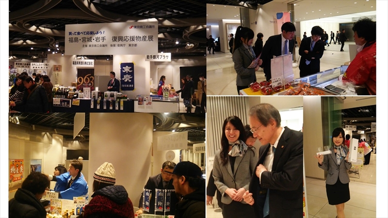 東京商工会議所は、被災地支援の一環として「福島・宮城・岩手 復興応援物産展」を、福島県東京事務所、宮城県東京事務所、岩手県東京事務所等の協力のもと 2月8日(水)・9日(木)の2日間にわたって、千代田区のJPタワー・KITTE地下1階「東京シティアイ」で開催しました。