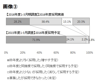 ○昨年度の調査で採用数を増やす予定と回答した企業が約7割なのに対し、実績は